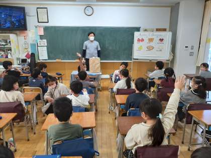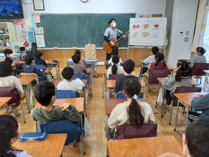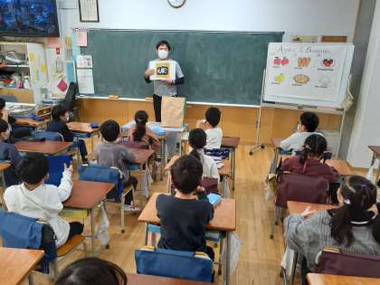 外国語の時間です。今日は波照間先生が4組の外国語を担当しました。英語を使った歌やゲームに楽しんで取り組みました。