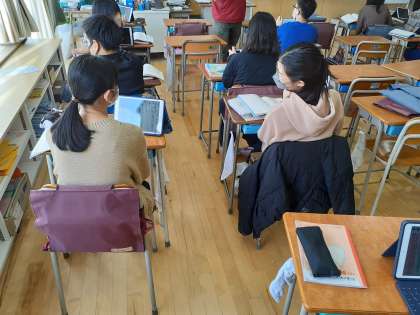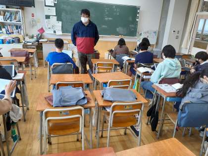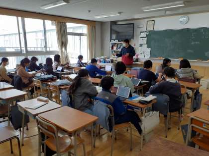 国語の時間です。ロイロノートを使って、要旨をまとめ、自分の考えを交流しました。