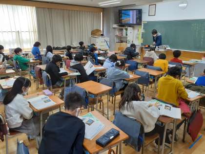 道徳の時間です。日本の伝統文化である浮世絵には、様々な人たちの思いや技術が込められていることを知りました。