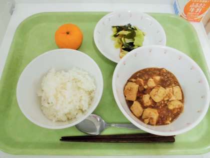 献立 ご飯、麻婆豆腐、わかめサラダ、ぽんかん、牛乳