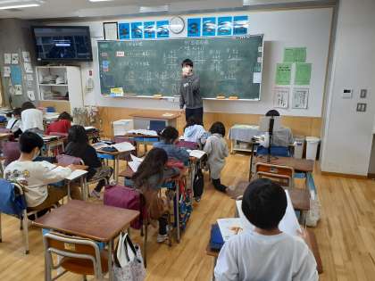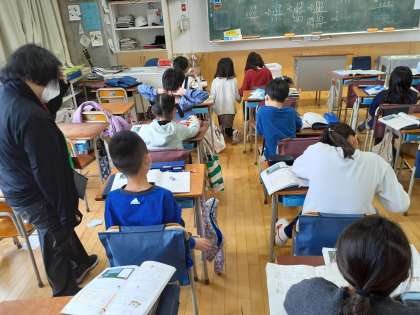 算数の時間です。二けた×二けたの筆算の学習をしました。九九と繰り上がりを間違えないように解きました。