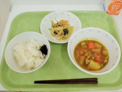 献立 ご飯、のりの佃煮、カレー肉じゃが、サクサク高野豆腐のサラダ、牛乳