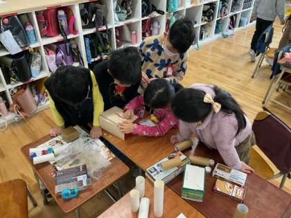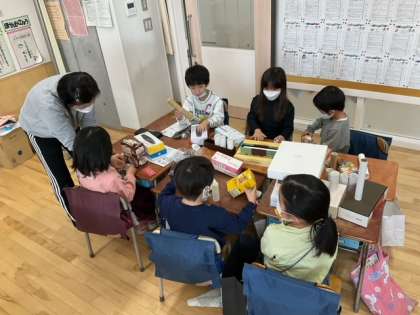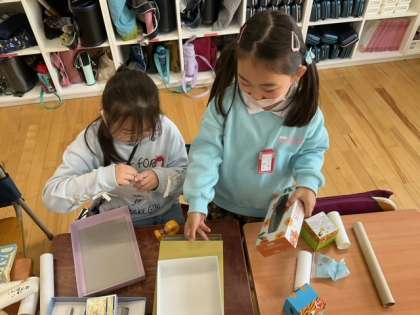 図工の時間です。「はこと はこを くみあわせて」箱の組み合わせを工夫して、グループで大きな作品を作っています。