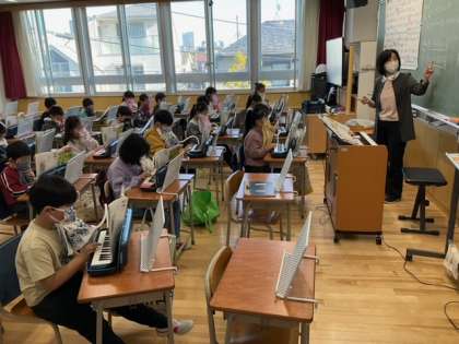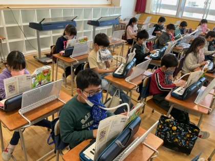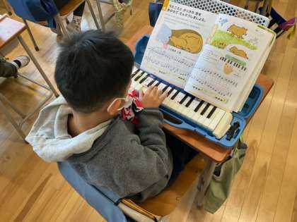 音楽の時間です。鍵盤ハーモニカで「こぐまの二月」を演奏しています。指づかいが上手になりましたね。