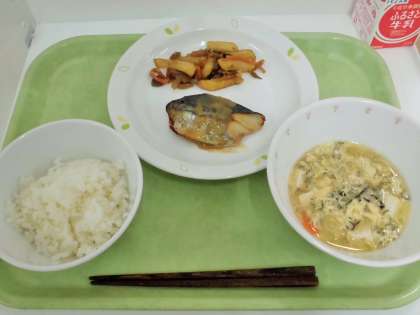 献立 ご飯、さわらのゆずみそかけ、じゃが芋のきんぴら、めかたま汁、牛乳