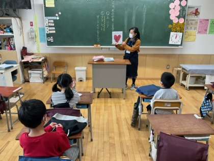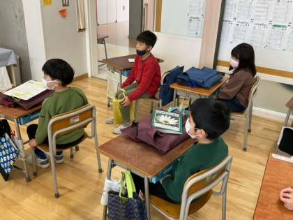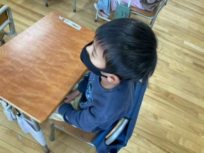 読書の時間です。司書の先生による読み聞かせです。今日は「あかいてぶくろ」というお話でした。