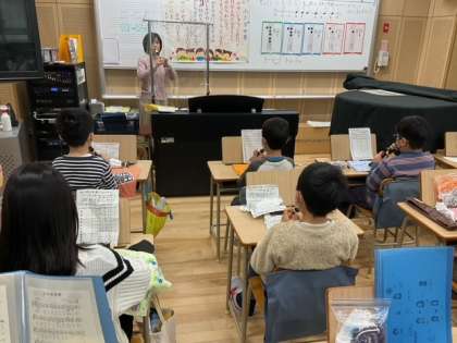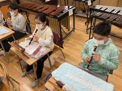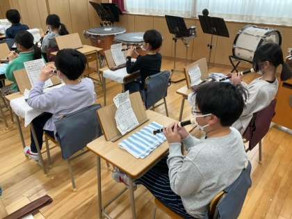 音楽の時間です。一音一音を確かめながら、きれいな音が出るようにリコーダーの練習をしています。