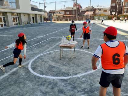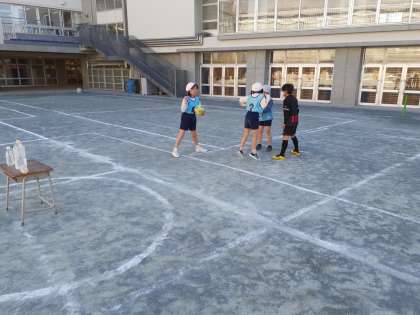 体育の時間です。ペットボールにも随分慣れてきたようです。チームで作戦を立て練習に取り組みました。