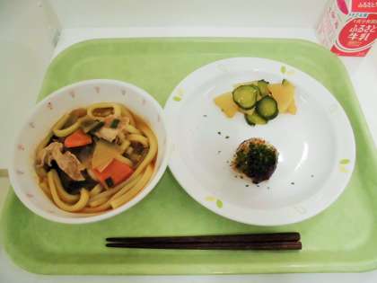 献立 キムチ煮込みうどん、大根ときゅうりのごま風味和え、ポテトたこ揚げ、牛乳