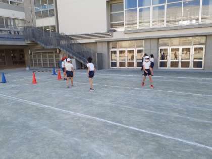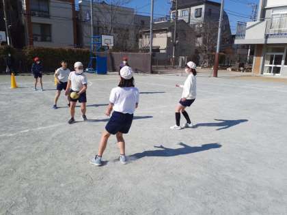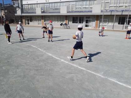 体育の時間です。ハンドボールの学習が始まりました。チームでどのように動けばよいか声を掛け合いながら取り組んでます。