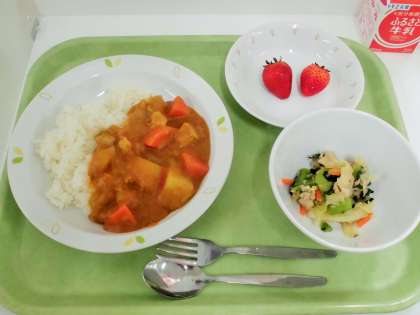 献立 チキンカレーライス、小松菜とツナのサラダ、いちご、牛乳