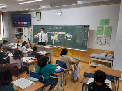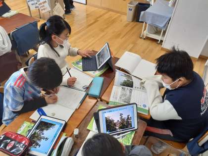 社会の時間です。世田谷区のうつりかわりについて、100年前ごろの写真と今の写真を比べて考えました。
