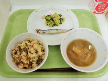 献立 豚肉とごぼうの混ぜご飯、焼きししゃも、野菜のゆかり和え、さつま芋のみそ汁、牛乳