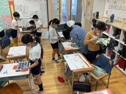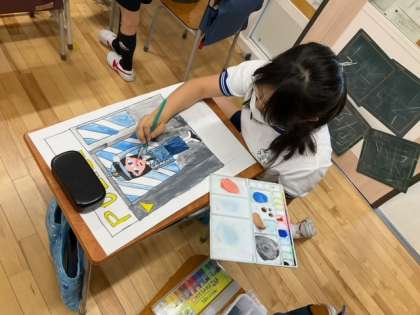 図工の時間です。「未来にタイムスリップ」夢が叶った瞬間を絵にしています。どんな夢が叶ったのかな?