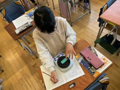 理科の時間です。「ものの重さを調べよう」同じものの形や置き方を変えると、ものの重さは変わるかどうかを調べています。