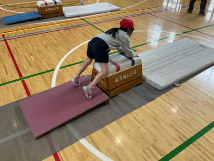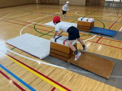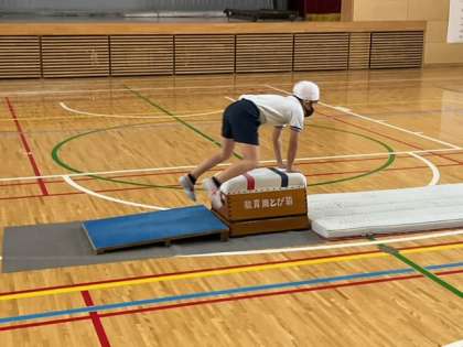 体育の時間です。跳び箱に取り組んでいます。踏み切りが力強くなってきましたね。その調子です。