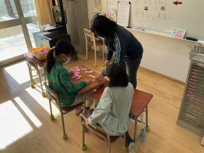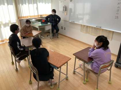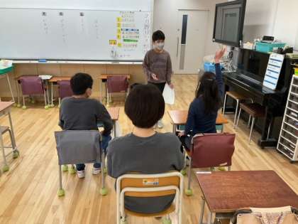 日常の時間です。お休み明けの1時間目は、休みの日の出来事についてのスピーチです。質問をしながら進めています。