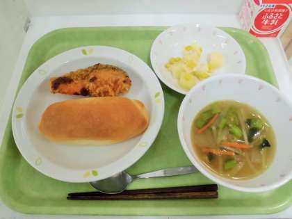 献立 米粉パン、鮭フライ、コーンポテト、せん切り野菜スープ、牛乳