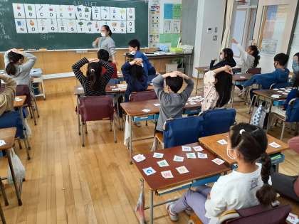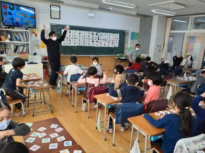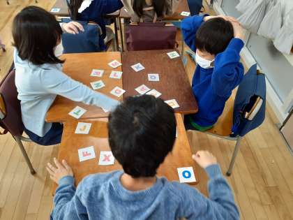 外国語の時間です。アルファベットの学習をしました。覚えたアルファベットをカルタで確認しました。