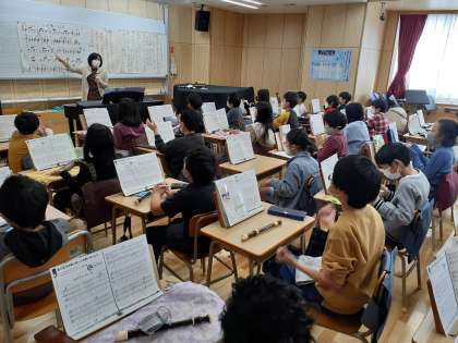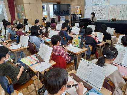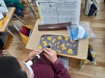 音楽の時間です。ジッパディードゥーダーという曲をリコーダーで練習しました。難しいリズムが弾けるようになって喜ぶ姿もありました。