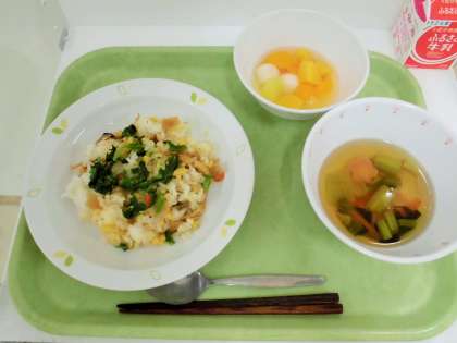 献立 菜の花ちらしずし、小松菜のすまし汁、白玉フルーツポンチ、牛乳