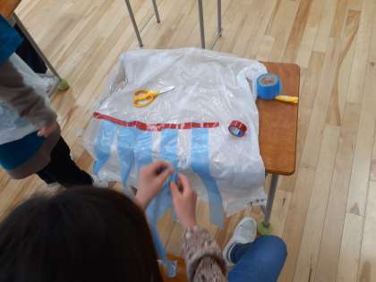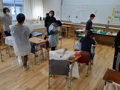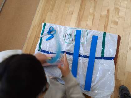 図工の時間です。みじかなもので大変身!忍者やヒーロー、自分が変身したいものを作っています。
