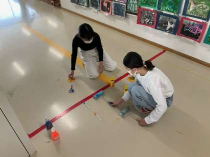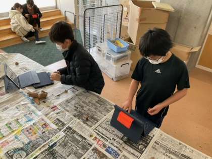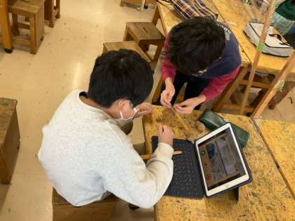 図工の時間です。「Myキャラが動き出す」オリジナル動画を作成しています。キャラクターが生き生きと動いています。