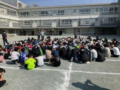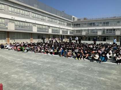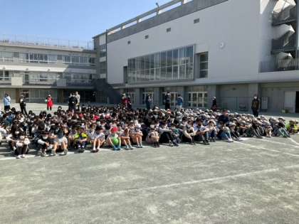 今日は、シェイクアウト訓練を行いました。命を守る3動作である「姿勢を低くする、頭と体を守る、揺れが収まるまでじっとしている」を身につける訓練です。