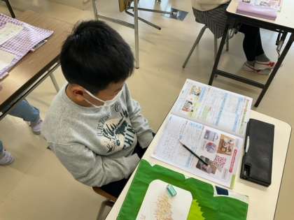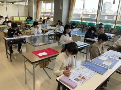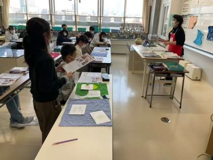 家庭科の時間です。この1年間で多くの作品を作りました。今日は、作品の振り返りをしています。