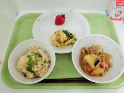 献立 たい飯、肉じゃが、カリカリ油揚げのサラダ、いちご、牛乳