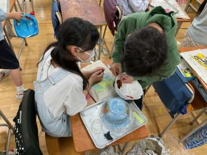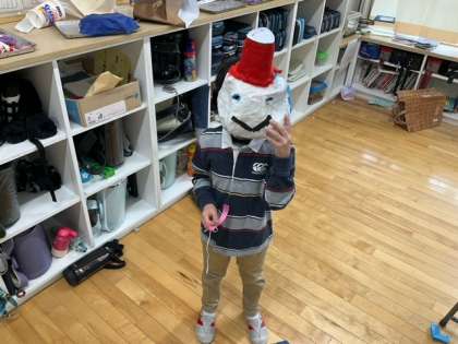図工の時間です。「かぶって へんしん」すてきなお面ができましたね!