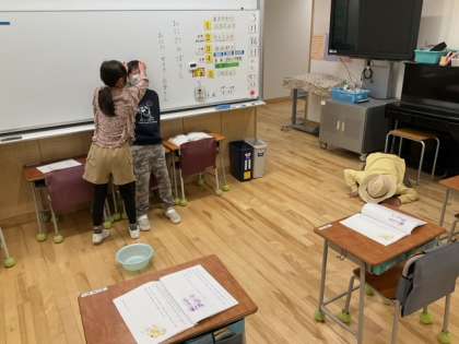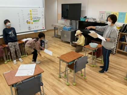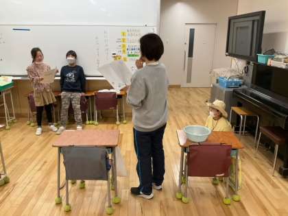 日常の時間です。「おにたのぼうし」おにたとお母さん、女の子に分かれて、演技の練習を進めています。