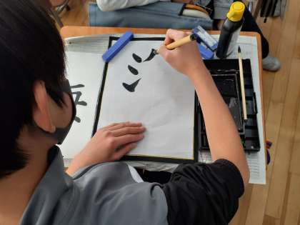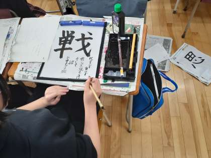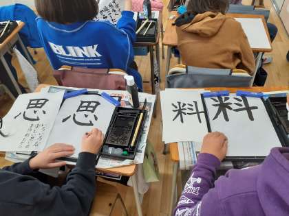 国語の時間です。自分の好きな文字に理由を添えて、筆で書きました。