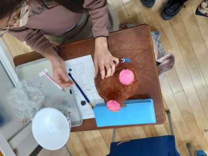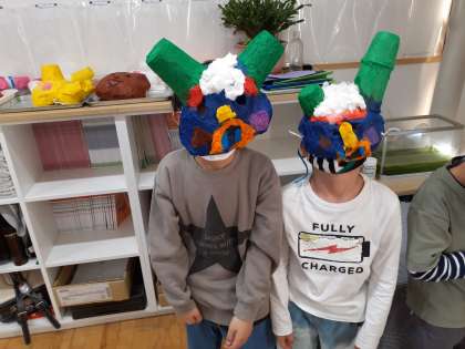 図工の時間です。ゴムひもを通してお面が完成しました。