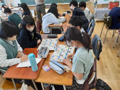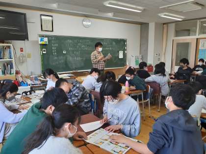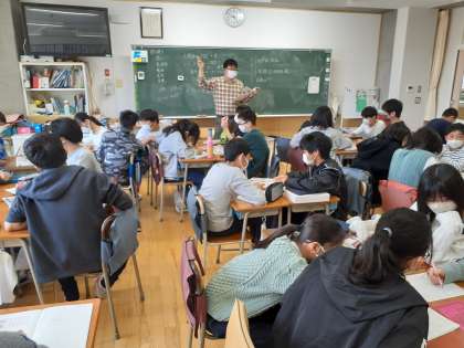 社会の時間です。先生から出題される歴史上の人物クイズにグループで協力して取り組みました。