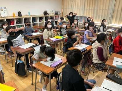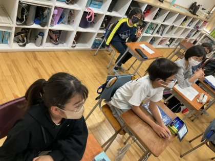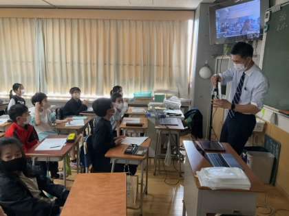 総合的な学習の時間です。日野市の小学校とオンラインでつないで、交流学習を進めています。お互いの学校の良いところを紹介し合っています。