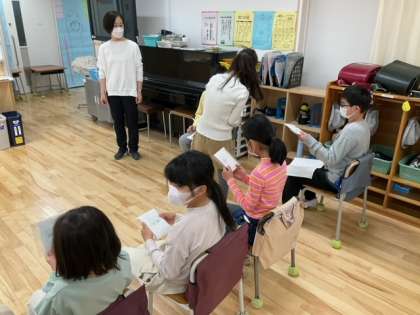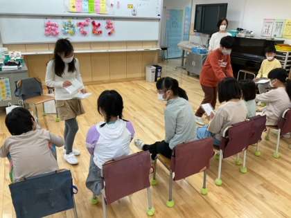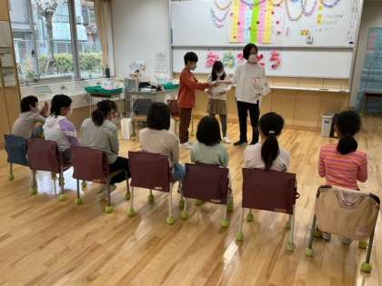 卒業を祝う会を行っています。卒業生から一人一人にプレゼントが渡されました。