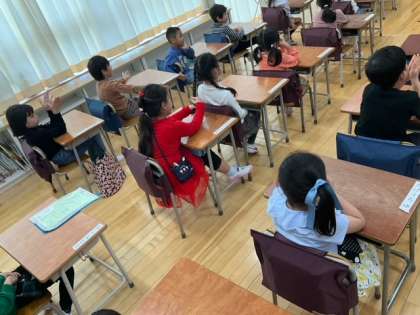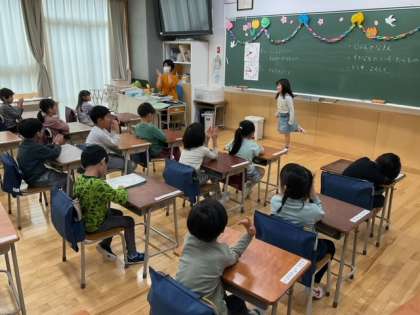 学級活動の時間です。自己紹介をしています。大きな拍手がすてきですね。