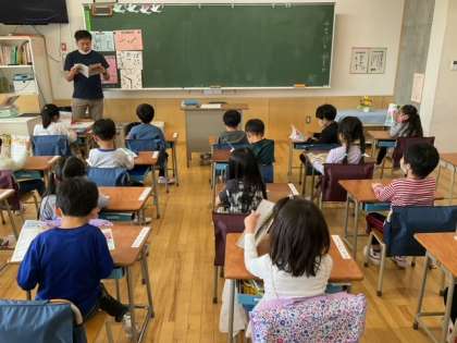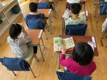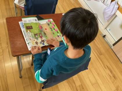算数の時間です。教科書を開いてみました。算数では、どんな勉強をするのかな? 楽しみですね。