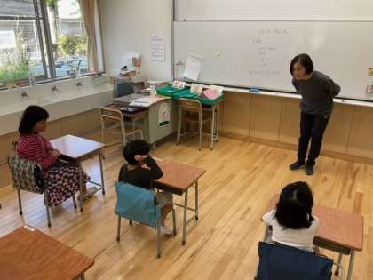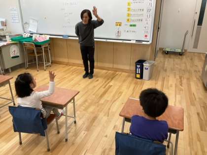 健康観察をしています。みんな元気です。返事がとても素晴らしいですね。