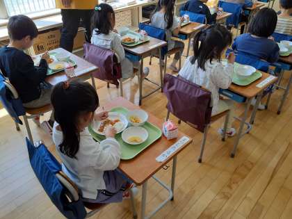 初めて食べる下北沢小学校の給食です。牛乳パックのストローを入れるのも難しそうにしている場面も見られましたが、カレーを美味しそうに食べていました。