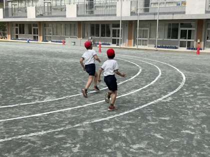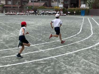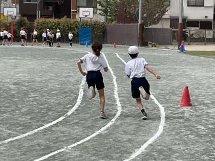 体育の時間です。短距離走のタイムを計測しています。3年生になると、カーブ走が入ってきます。