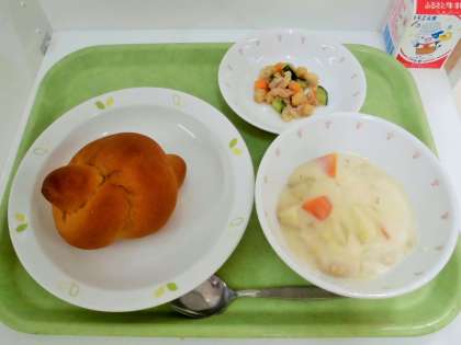 献立 黒砂糖パン、クリームシチュー、ビーンズサラダ、牛乳