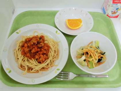 献立 ミートソーススパゲッティ、パリパリポテトのサラダ、清見オレンジ、牛乳