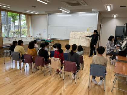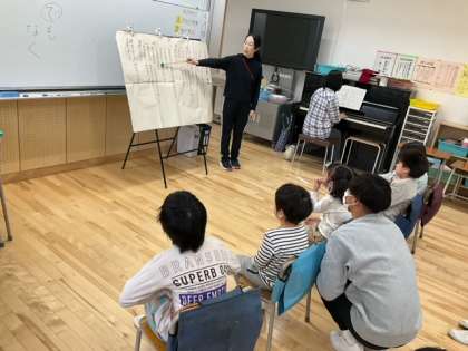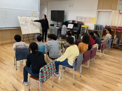 音楽の時間です。下北沢小学校の校歌を練習しています。1年生も早く覚えてくださいね。