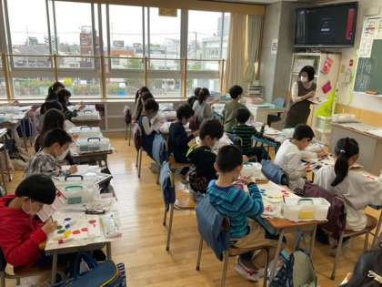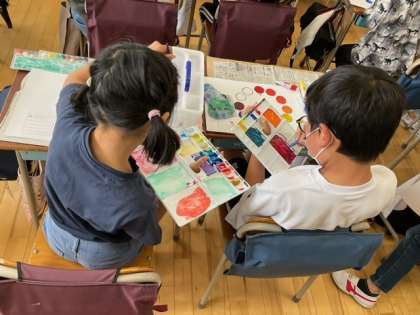 国語の時間です。絵の具の色を混ぜて、いろいろな色を作っています。とても楽しそうに活動しています。