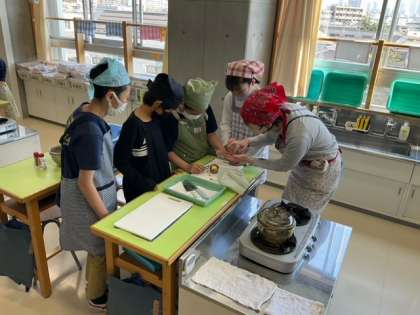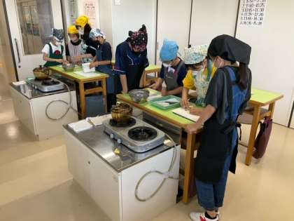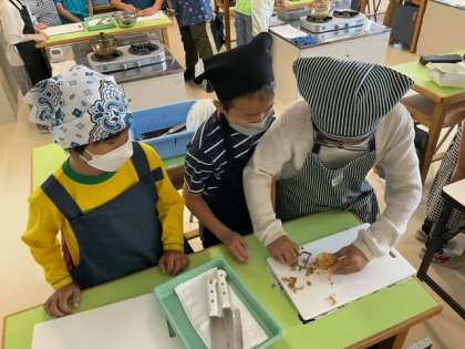 家庭科の時間ですゆでいもを作ります。まずは、ピーラーでじゃがいもの皮むきをしています。川場移動教室の練習にもなりますね。