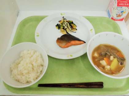 献立 ご飯、鮭の照り焼き、小松菜とえのきののり和え、具だくさんみそ汁、牛乳