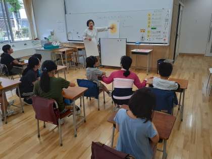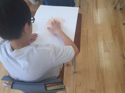 図工の時間です。○年生になった自分を描きます。チョークの粉で顔の形と色を作りました。