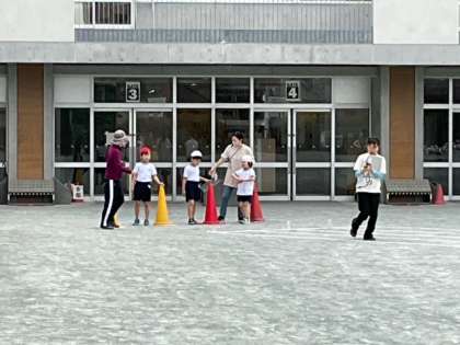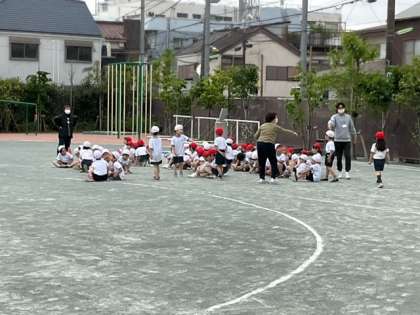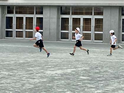 体育の時間です。「かけっこ」の練習です。一生懸命に腕を振って、元気いっぱいに走っています。